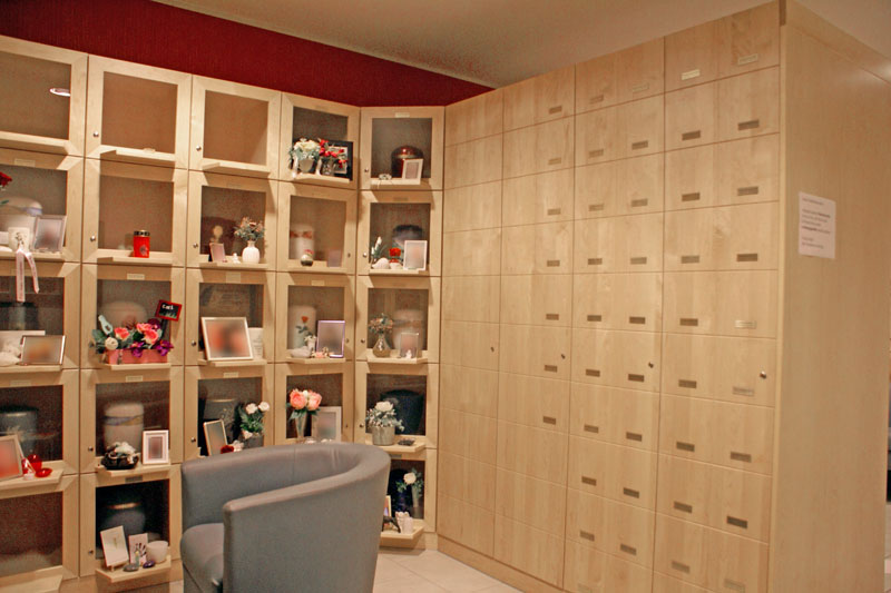 Der Alt-Katholische Kolumariumsfriedhof bei uns im "Haus des Abschieds" wurde 2011 errichtet und hebt sich nicht nur optisch von den traditionellen Grabstellen seiner Art ab. Statt aus Stein sind die Grabkammern aus Holz und haben zumeist eine Glasscheibe als Front, sodass man die Urne auch nach der Einstellung noch sehen kann. Entgegen den Urnenwänden auf den anderen Friedhöfen in Solingen befindet sich unser Friedhof innerhalb des Gebäudes der Filiale in Ohligs. Er ist somit vor Wind und Wetter geschützt und bietet für die Angehörigen, die dies wünschen, einen 24-Stunden-Zugang. Somit kann man den Friedhof an jedem Tag im Jahr besuchen und ist nicht an Öffnungszeiten gebunden.